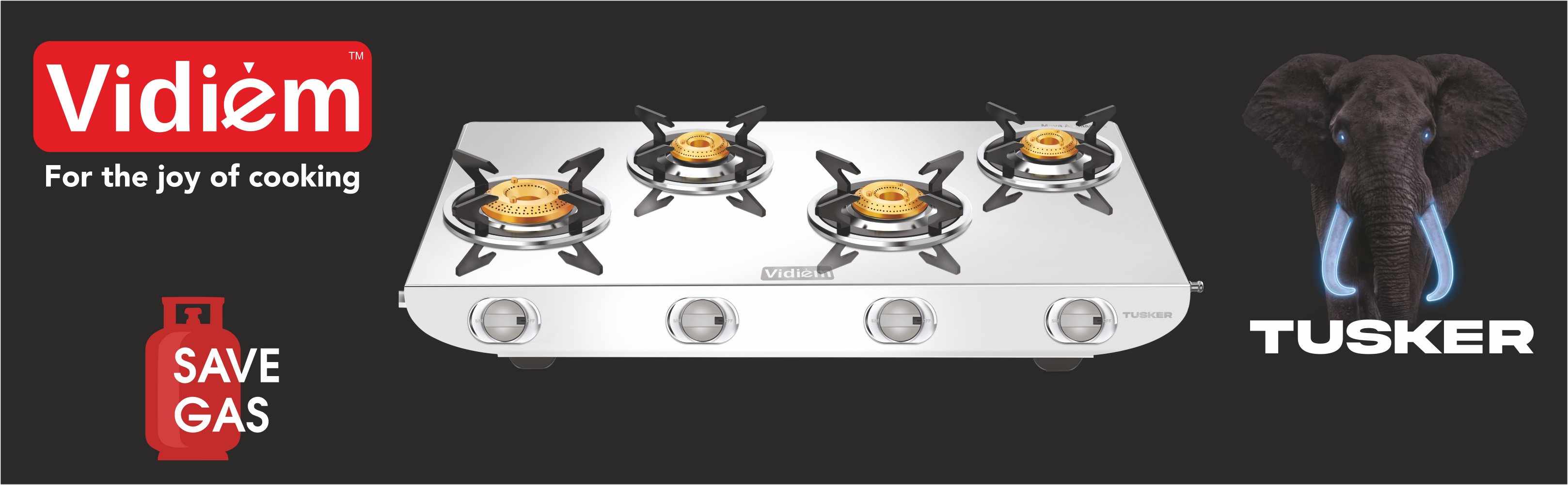 Vidiem Tusker Comes With 2mm High Gloss SS Body , Extra Large Cooking Surface & Widely Spaced Burners to accommodate Large Vessels with Jumbo, Medium & Small Dura Forged Brass Burners