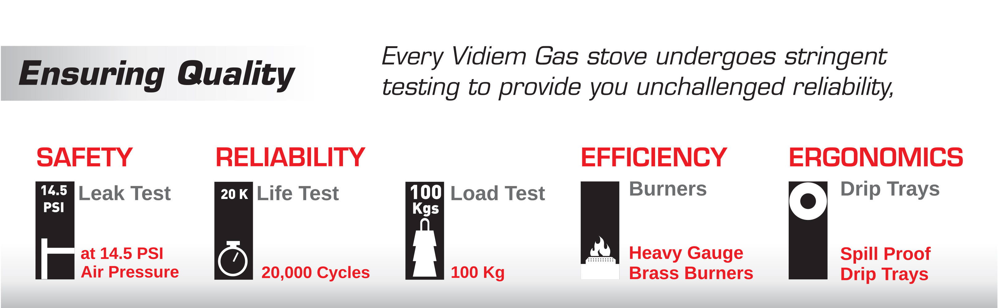 Life Time Warranty on SS Body, 5 Years warranty on Product. Every Vidiem Stove undergoes stringent tests - Leak Test, Life Test & Load Test to provide you unchallenged Safety, Reliability, Durability & Performance.