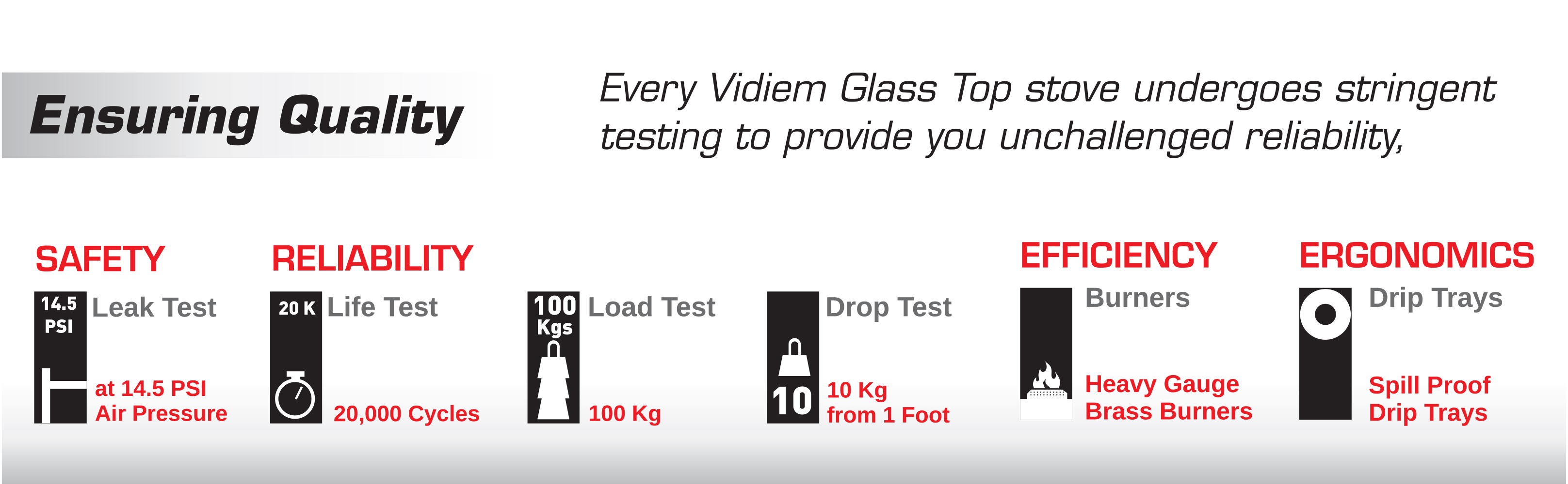 5 Years Warranty on Glass and 2 Year Warranty on the Product. Every Vidiem Glass-top Stove undergoes stringent tests - Leak Test, Life Test, Load Test & Drop Test to provide you unchallenged Safety, Reliability, Durability & Performance.