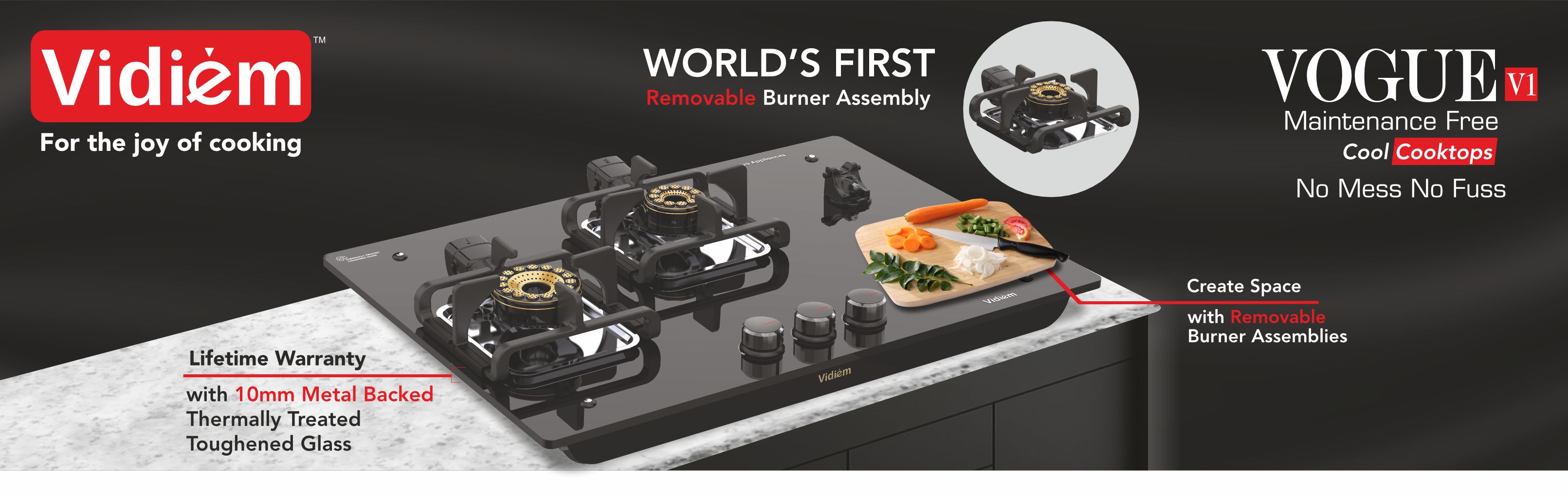 Vidiem, India's First brand to offer 10 MM Metal-Backed Toughened Glass, ensures superior Durability and Heat Resistance. It's backed by a reassuring Lifetime Warranty. Transform your cooking space with confidence and take your kitchen to the next level.