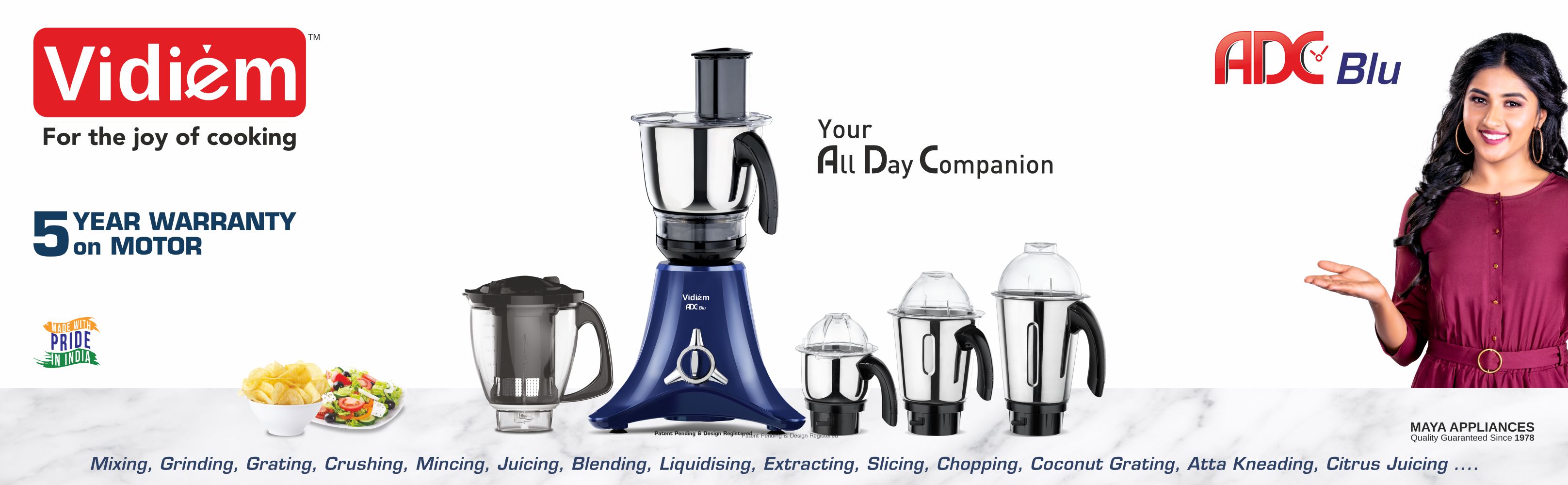 Vidiem ADC Blu - Your All Day Companion Mixing, Grinding, Grating, Crushing, Juicing, Blending, Liquidising, Extracting, Thick Slicing, Chopping, Mincing, Coconut Grating , Atta Kneading, Citrus Juicing… 2.5 Litre Stainless Steel Multi Chef with Double reduction Gear Box for High Torque & Low Noise with Polycarbonate Lid.