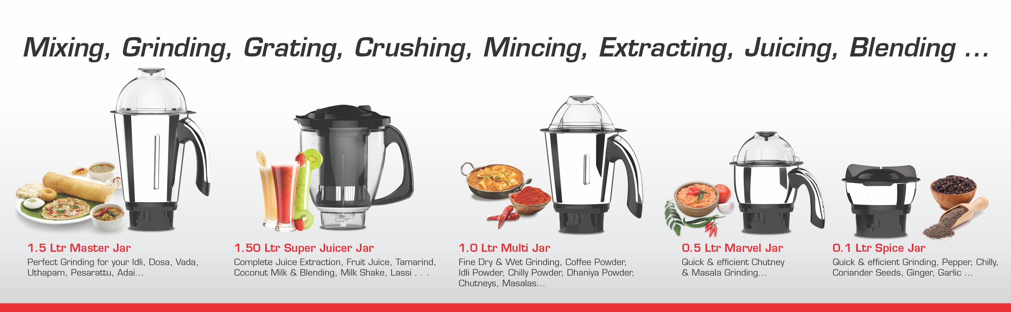 Deliciousness on your Plate -Grinding Idli, Dosa, Vada, Uthapam, Pesarattu, Adai, Appam, Roasted Cereals, Raw Rice, Garam Masala, Molagai Podi, Dhaniya Powder ,Jeera Powder, Curry Leaf Powder, Coffee Powder, Sambar Powder , Rasam Powder , Meat Mincing , Vegetable Grating , Ice Crushing…